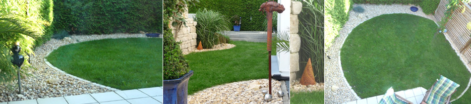 Der bestehende Garten eines Einfamilienhauses sollte ein prägnantes "Gesicht" bekommen, das gleichzeitig vorhandene Problemzonen löst, die zwei mit schmalem Durchgang verbundenen Gartenteile verknüpft und ein ansprechendes Arrangement der vorhandenen Sammlung von Keramikobjekten erlaubt. ![]() |