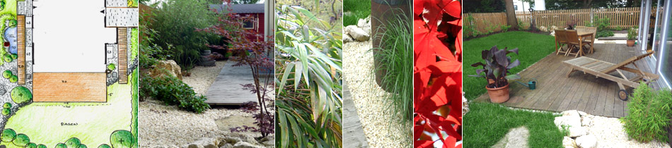 Das Grundstück um einen Neubau mit umgebendem altem Baumbestand im Westen Münchens sollte ein nutzbarer Rückzugsbereich mit japanischem Touch und Akzent auf schönem Herbstaspekt werden. Geplant haben wir eine freie Wiesenfläche im hinteren, zentralen Gartenbereich um die Holzterrasse herum, eingerahmt mit einzelnen Ziersträuchern. Die Gartenzugänge längs beider Hausseiten, auch Ausblick vom Sitzbereich im Haus aus, gestalteten wir ebenfalls mit Holzstegen, gelagert über Kiesflächen mit einzelnen Findlingen, Azaleen, Bambuspflanzungen, einem Fächerahorn sowie einem kleinen Teich. Der Hausvorbereich ist pflegeleicht mit blühenden Bodendeckern und Buchs angelegt. ![]() |