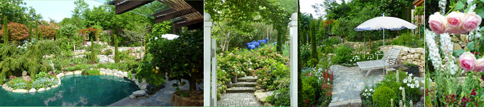 Neben dem aufwändigen Umbau des Bestandshauses sollte das umgebende hängige Gelände in eine üppige romantische Oase mit Teich und Sitzplätzen verwandelt werden. Wir schufen eine weite Holzterrasse mit vorgelagertem Zierteich. In den mittels kleiner Trockenmauern gestuften Hang verteilt entstanden eine Sonnenterrasse und mehrere Plätze mit völlig verschiedener Aufenthaltsqualität wie z.B. ein verwunschen überwucherter Pavillon und ein künstlerischer Sitzplatz. Auf der gegenüberliegenden Gebäudeseite bietet sich im Sommer ein schattiger, der Küche vorgelagerter Platz zum Verweilen an, der über einen geschwungenen schmalen Weg auch vom Vorplatz aus erreichbar ist. Die im gesamten Konzept wiederkehrende Verwendung von hochwertigem Natursteinpflaster prägt auch die Hausvorfahrt, als Entrée führt eine Aufgangstreppe durch bepflanzte Trockenmauern mit Kunstobjekten hoch zum Eingang. Der ganze Garten wurde überbordend bepflanzt mit Stauden, Zwiebelpflanzen, Solitärsträuchern und verschiedenen großen Solitärbäumen als zusätzliche Blickpunkte je nach Jahreszeit; das übergreifende Gerüst bilden Säulenthujen in verschiedenen Höhen. ![]() |